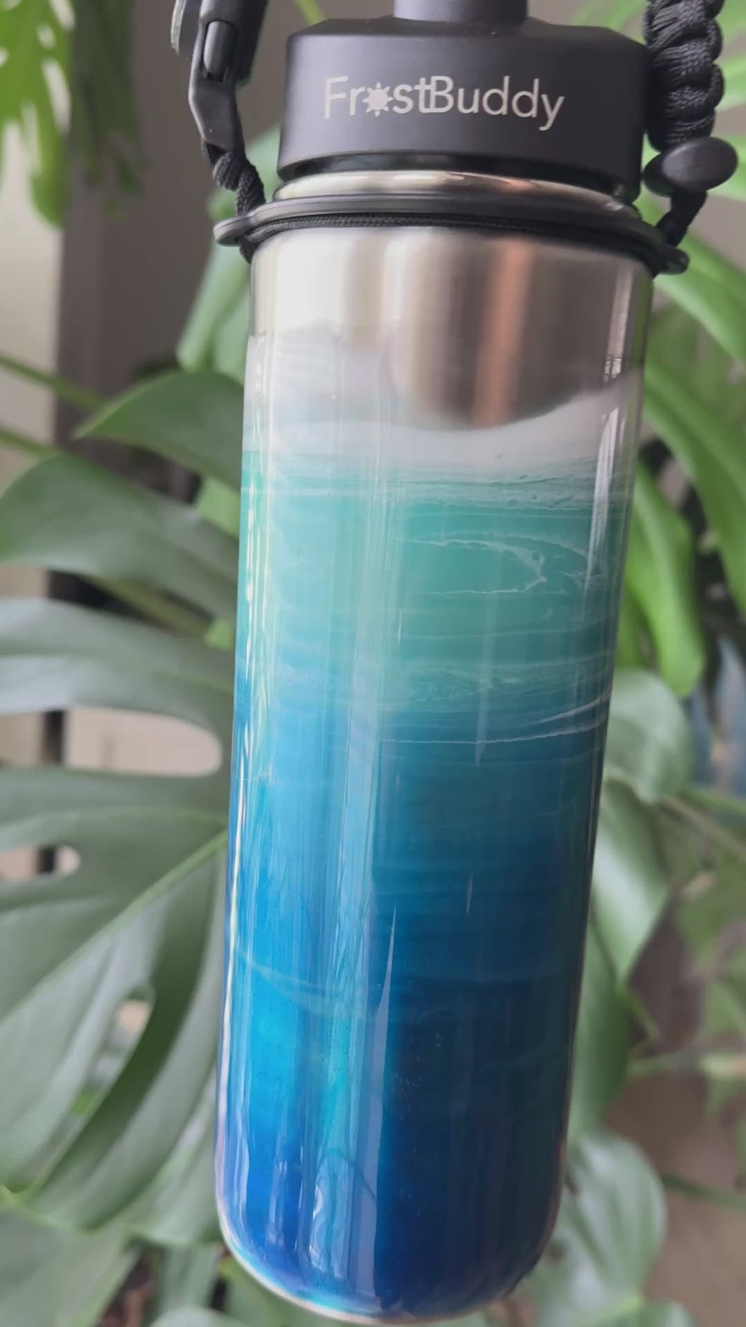 Enjoy your favorite hot or cold beverages wherever you are with this 24-oz. Stainless Steel Bottle. The bottle is a FrostBuddy Sports Buddy with resin ocean waves. It features a lid with a straw to prevent spills, making it ideal for outdoor activities, hikes, sports, travel, and more. The bottle is beautifully crafted with waves using epoxy resin, bringing the tranquility of the ocean into your home.