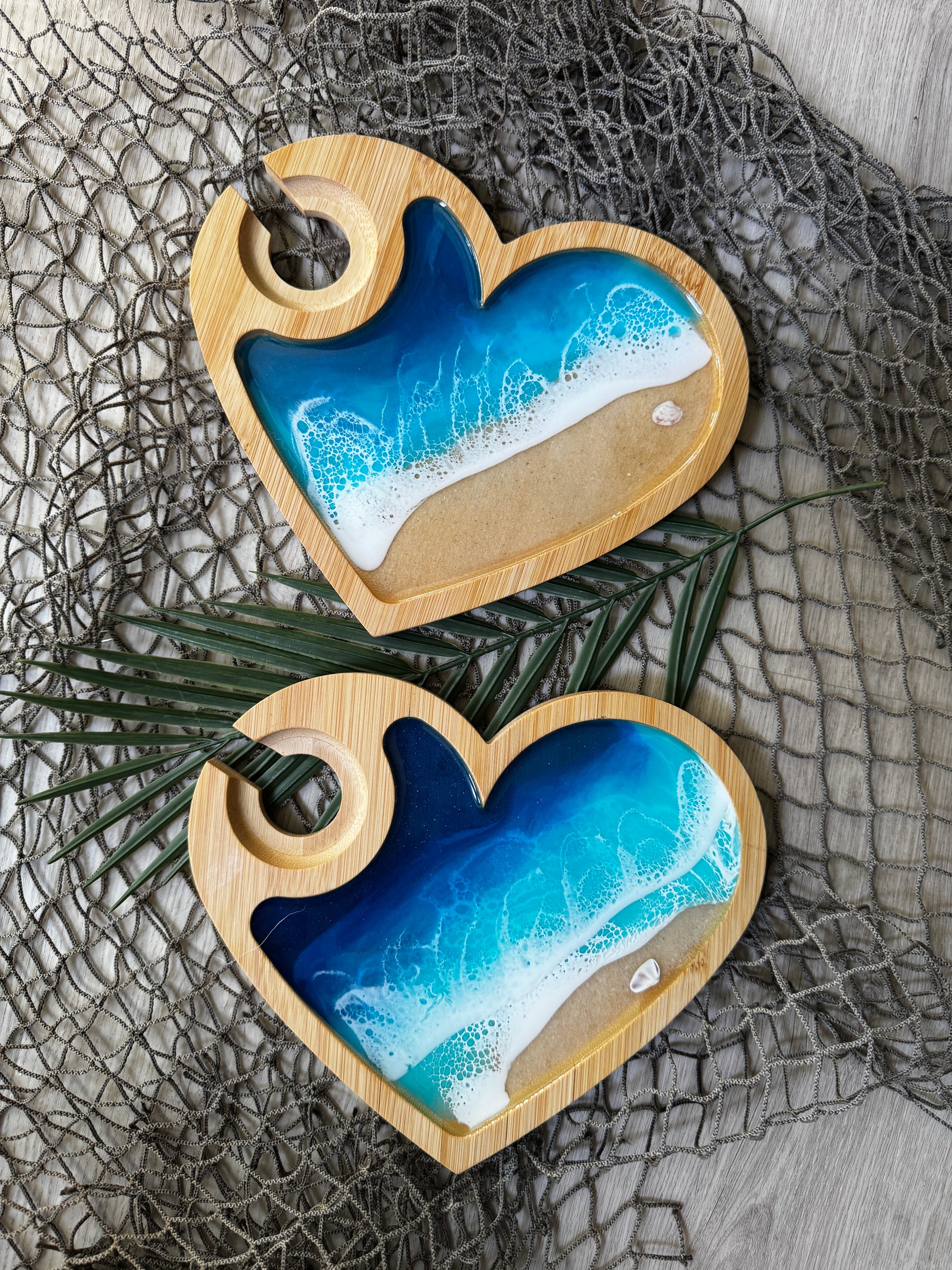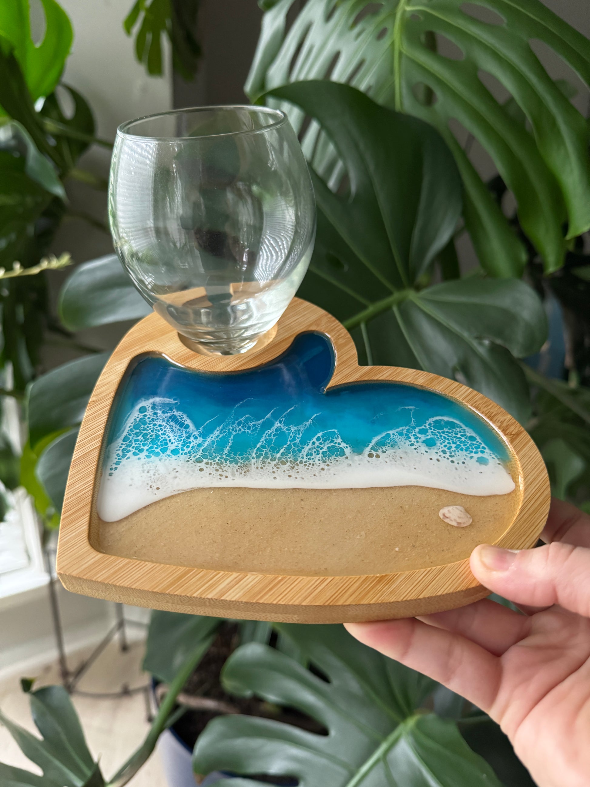 Surprise a beach lover with this unique bamboo charcuterie board featuring stunning epoxy resin waves, Gulf Coast sand, and a shell, creating a beautiful coastal touch. Designed to hold appetizers, cheeses, and snacks with an easy-to-use wine glass slot, it's perfect for parties, weddings, and housewarming gifts. Add a splash of the ocean to any occasion with this functional and decorative piece.