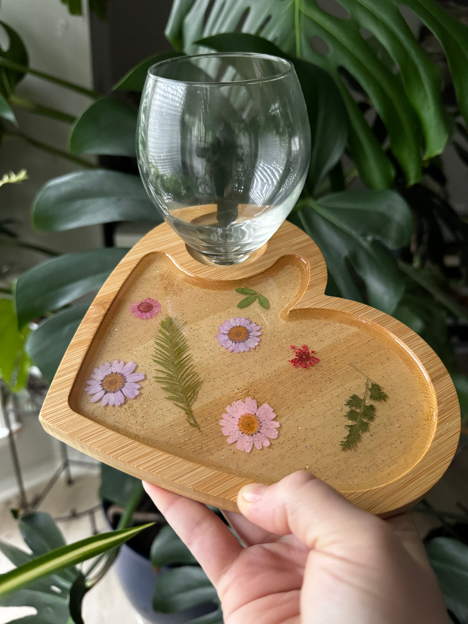 Surprise a beach lover with this unique bamboo charcuterie board featuring stunning epoxy resin with dried flowers. Designed to hold appetizers, cheeses, and snacks with an easy-to-use wine glass slot, it's perfect for parties, weddings, and housewarming gifts. Add a splash of the ocean to any occasion with this functional and decorative piece.