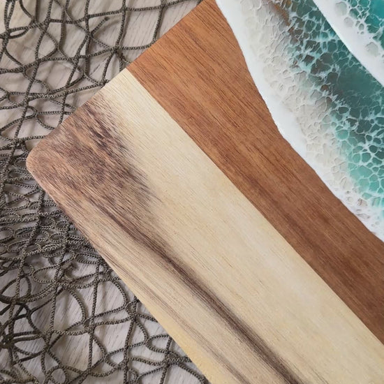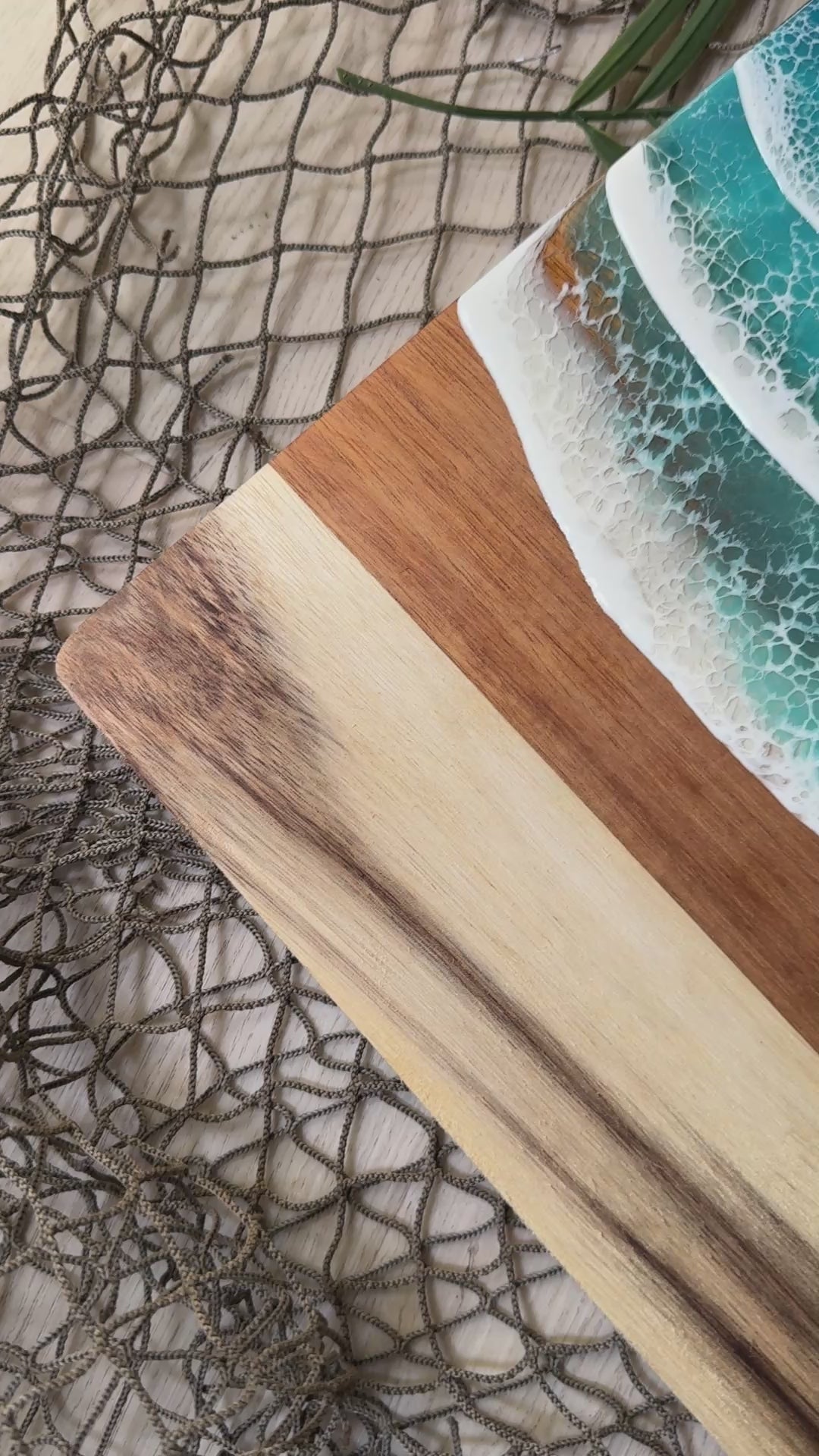 Elevate your hosting game with this stunning ocean-inspired charcuterie board, featuring crystal-clear blue epoxy resin waves flowing over a light wood surface. Perfect for serving cheese, meats, fruits, and appetizers, this handcrafted board is designed to be both functional and a conversation starter at any gathering!