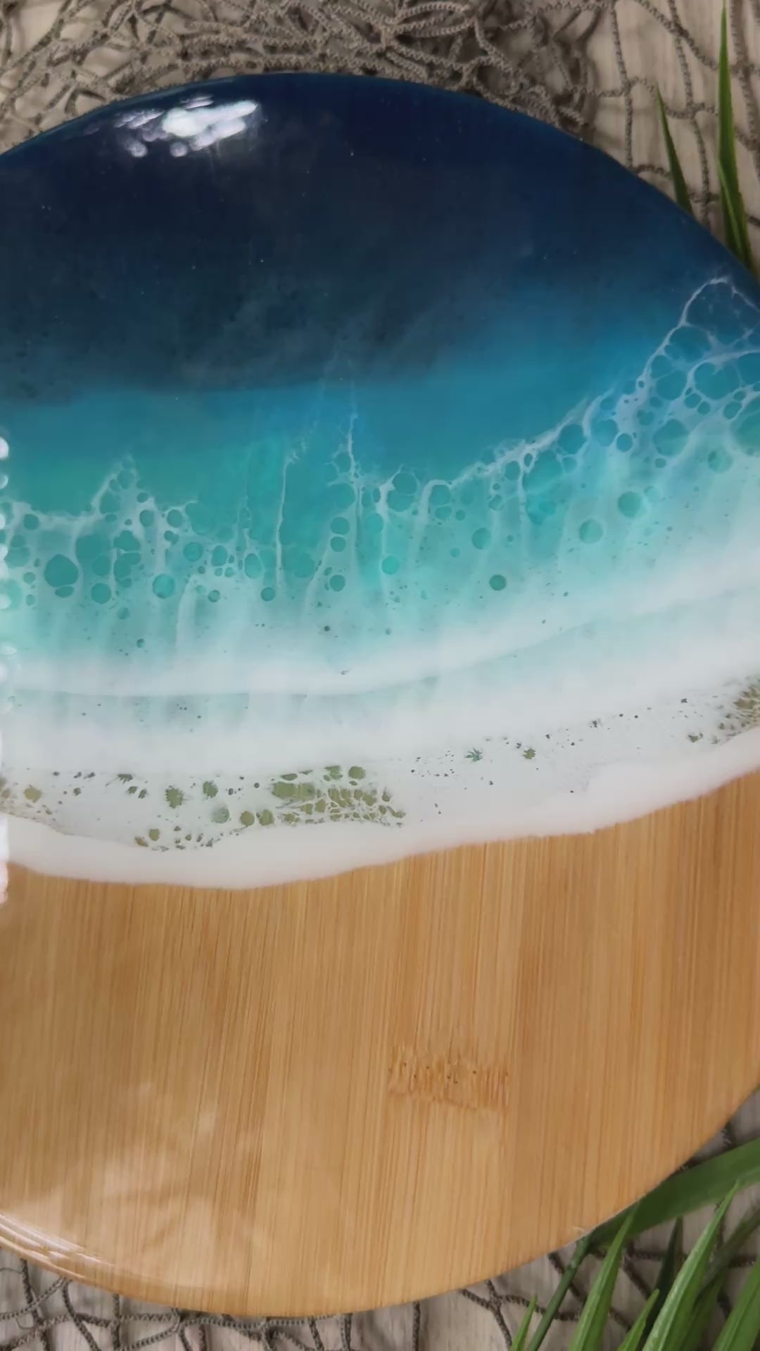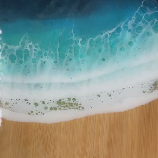Add coastal charm to your kitchen with this ocean-inspired resin and bamboo lazy susan. Crafted epoxy resin waves on bamboo, this functional art piece is ideal for entertaining, beach weddings, or a beach housewarming gift.