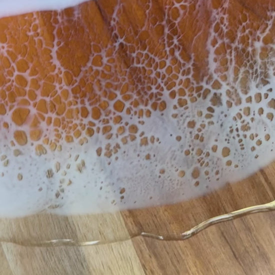 Pumpkin-shaped Acadia wood serving board embellished with resin waves of orange and purple to celebrate the fall season—coastal fall-themed decor, perfect for the beach and autumn lovers.