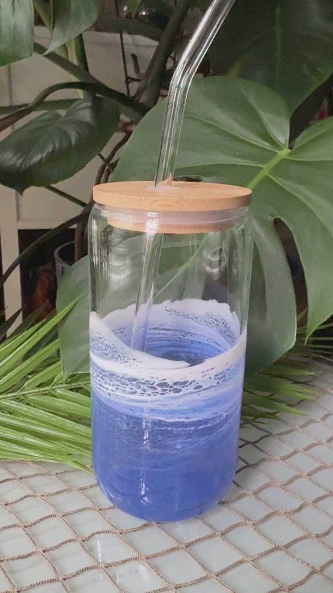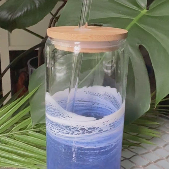 Glass cup with bamboo lid and glass straw. Purple ocean waves embellish the side to remind you of your favorite place - the beach!