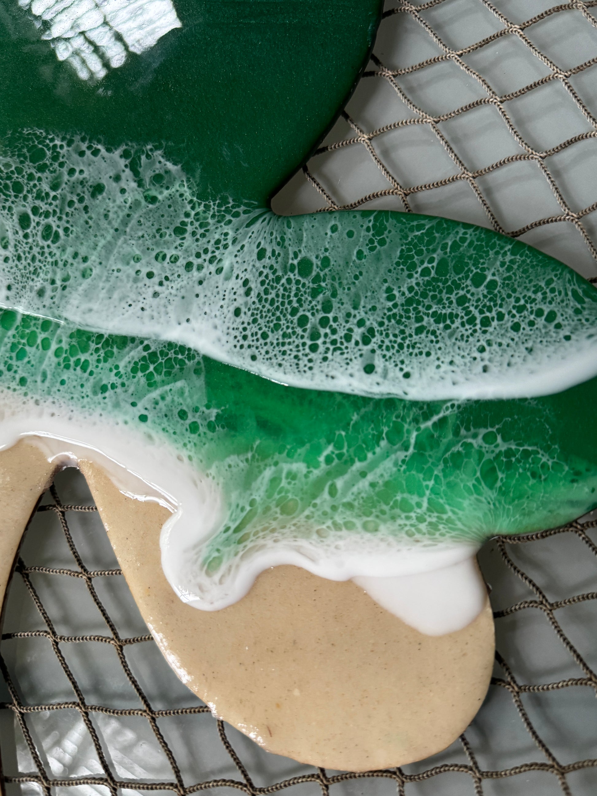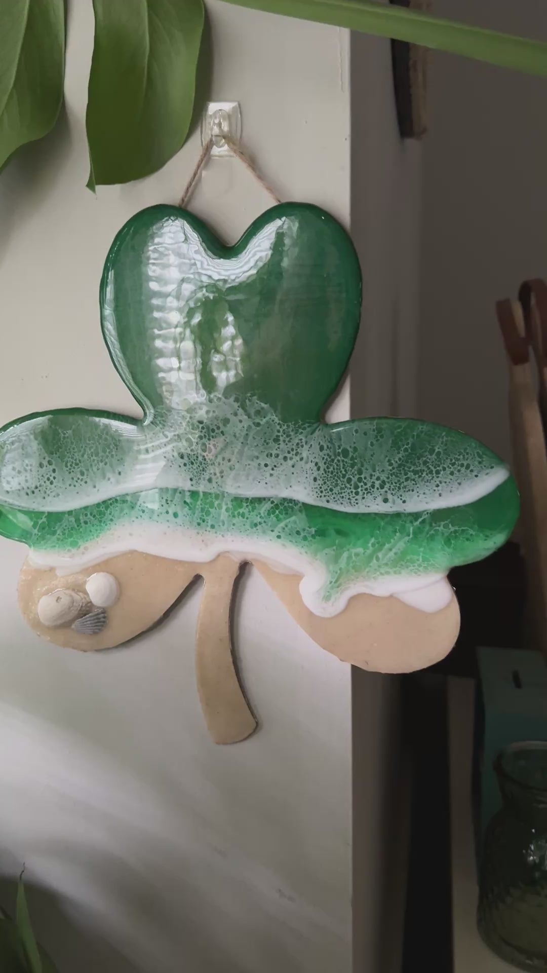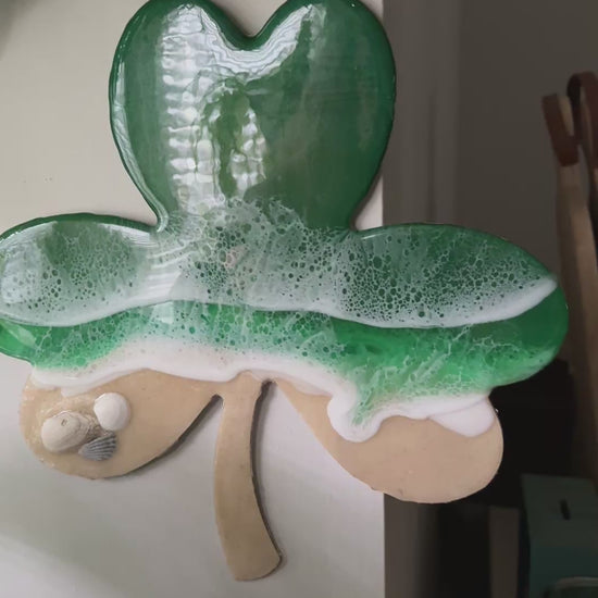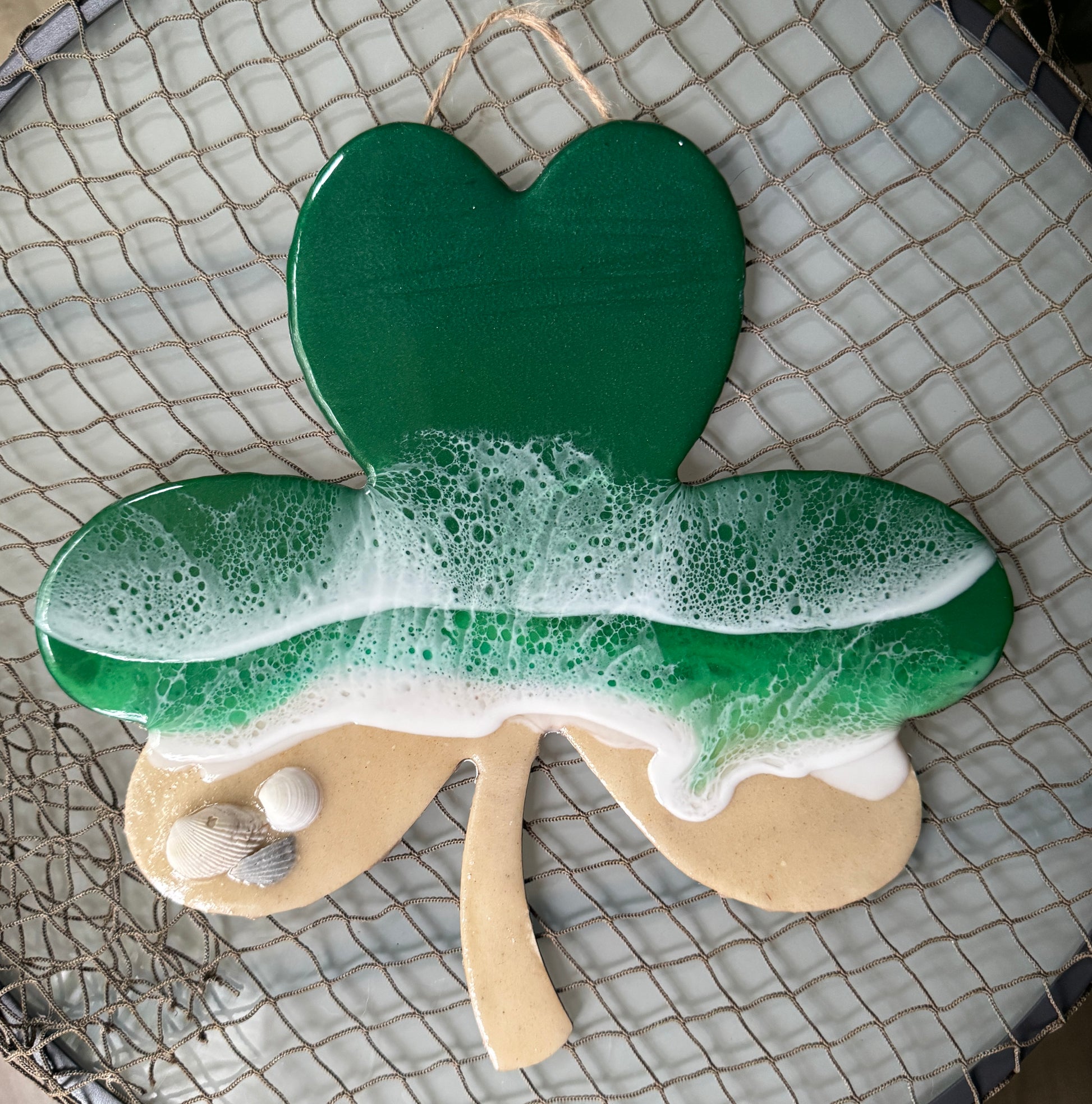 Bring the serenity of the ocean and the celebration of St. Patrick's Day into your home with this clover-shaped resin artwork, featuring green waves, and real sand. Crafted with high-quality epoxy resin, this unique piece beautifully captures the romance of the beach, making it the perfect St. Patrick's Day Decoration, or coastal home décor accent.